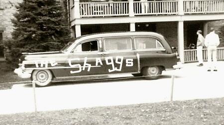 Another band, the Shamrocks, were our main competition for all the frat parties that were held almost every weekend at a place called the Laurel club on the other side of South Bend. It was far enough away from campus that the junior & senior class social organizations could rent it out, a floor for each class, & have bands, dancing & booze. It was a wild scene, great parties, girls dancing on the tables, guys doing the alligator on the floor. I had this 50-foot mic cord and I would wander the room & dance floor during certain songs. We had no cars at first, so the Shaggs would take 2 cabs there & back. Frank had it all worked out so all the equipment would fit in one cab & the 2 trunks (including his drums & the PA), & we would all cram into the other cab. Later, we saved up enough to get the hearse pictured above.